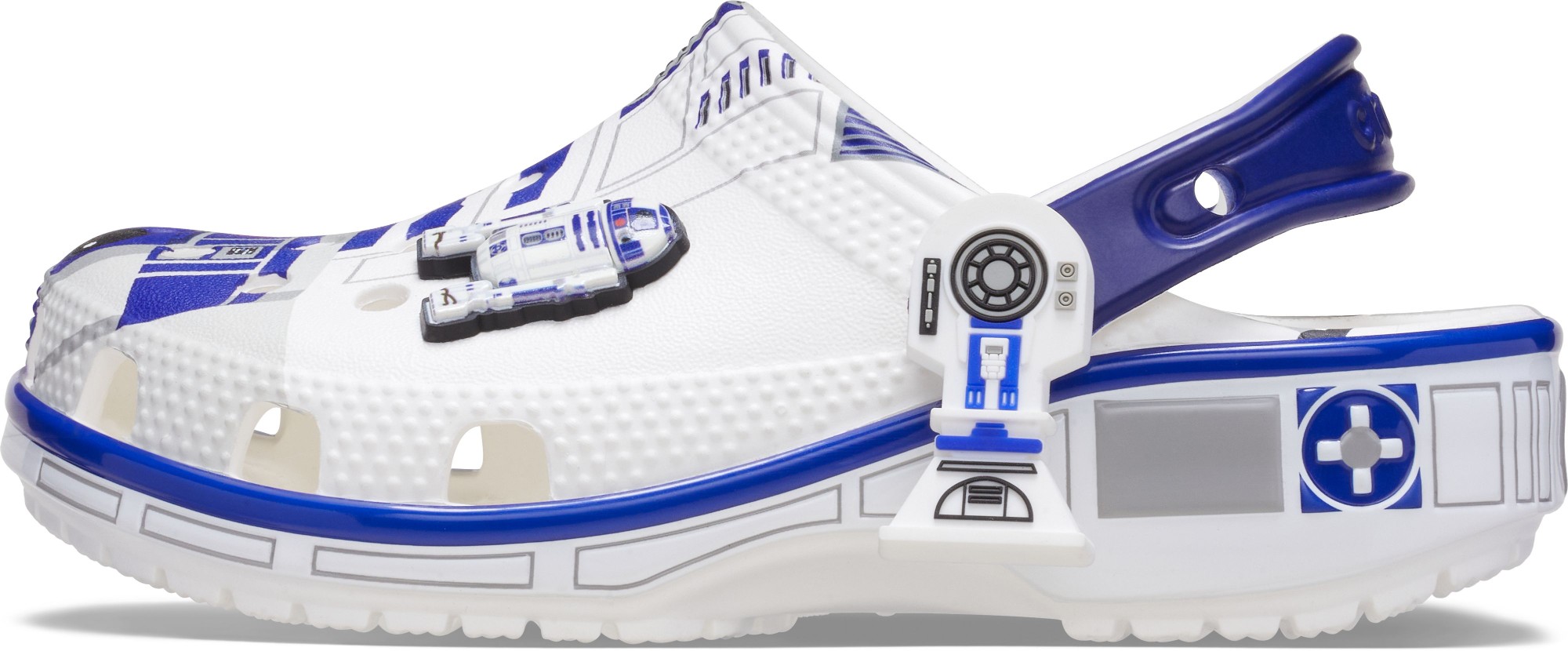 The heroic droid from the epic STAR WARS™ saga inspired this comfortable R2-D2 Classic Clog. This limited-edition design features printed droid details across the upper that embodies all the charm of R2-D2, with pivoting legs near each heel cup to complete this character-turned-clog design. This style is paired with two R2-D2 Jibbitz™ charms and plenty of space for more personalization to show off your STAR WARS™ fandom.